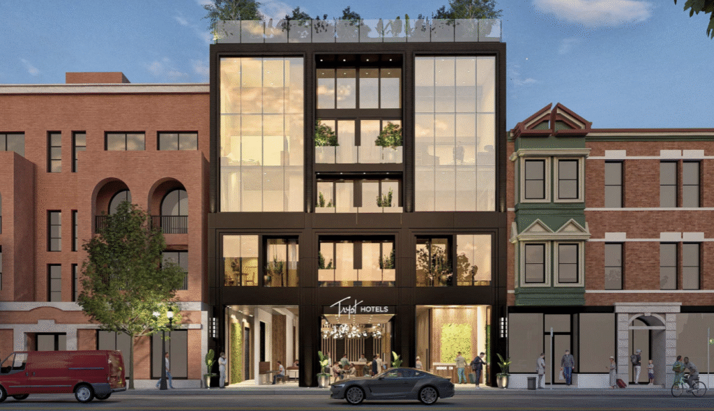 Tryst Hotels and NewLook have proposed a Planned Development at this site. This development would include a 21-unit hotel, restaurant, venue space, and rooftop space with two pools, a terrace, and a retractable roof. Materials include steel, brick, and glass. For more information such as the building plans existing site conditions, proposed conditions, and more, see the presentation below. To leave feedback, please call our office at (773) 525-6034 or email us at Ward44@CityofChicago.org.