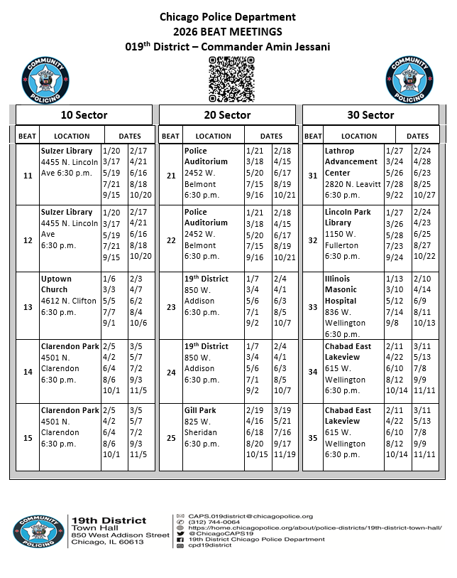 See the images below to find your beat and see meeting dates and locations. Search by address here. See our local 19th District’s website here. Email CAPS.019District@chicagopolice.org or our office with any questions.