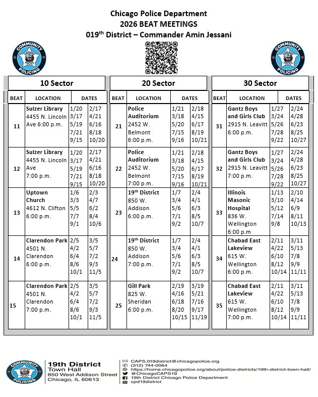 See the images below to find your beat and see meeting dates and locations. Search by address here. See our local 19th District’s website here. Email CAPS.019District@chicagopolice.org or our office with any questions.